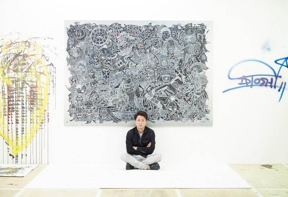 今回、個展の開催発表とともに、大野くんが自身の絵の前に座っている写真も公開されました。