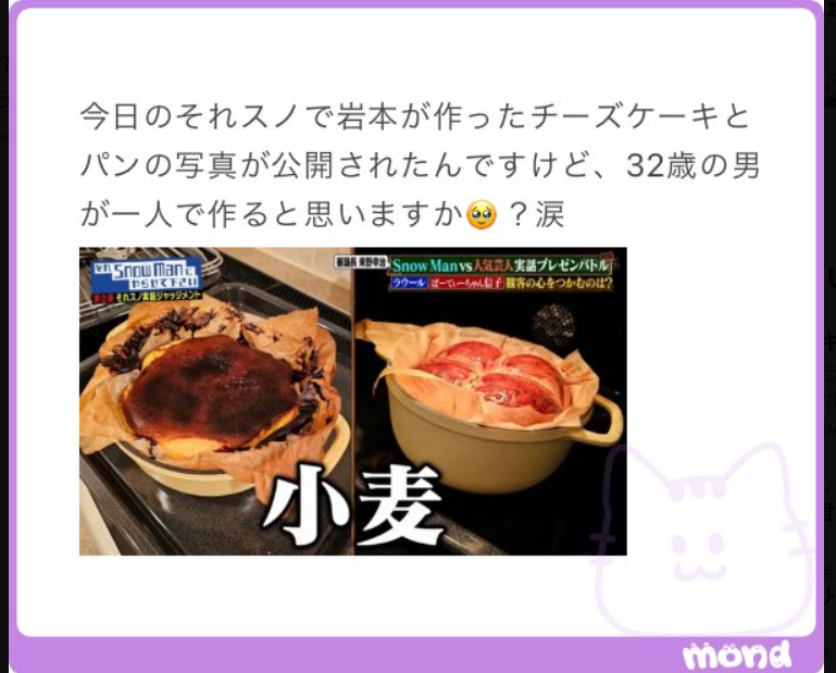 岩本照くんが作ったチーズケーキとパンが上手過ぎるということなのですが…