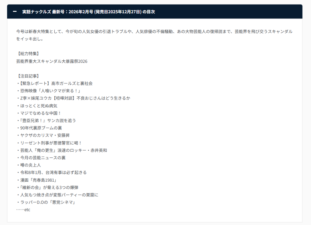 念の為、実話ナックルズのWeb版も確認しましたが該当記事はありませんでした。